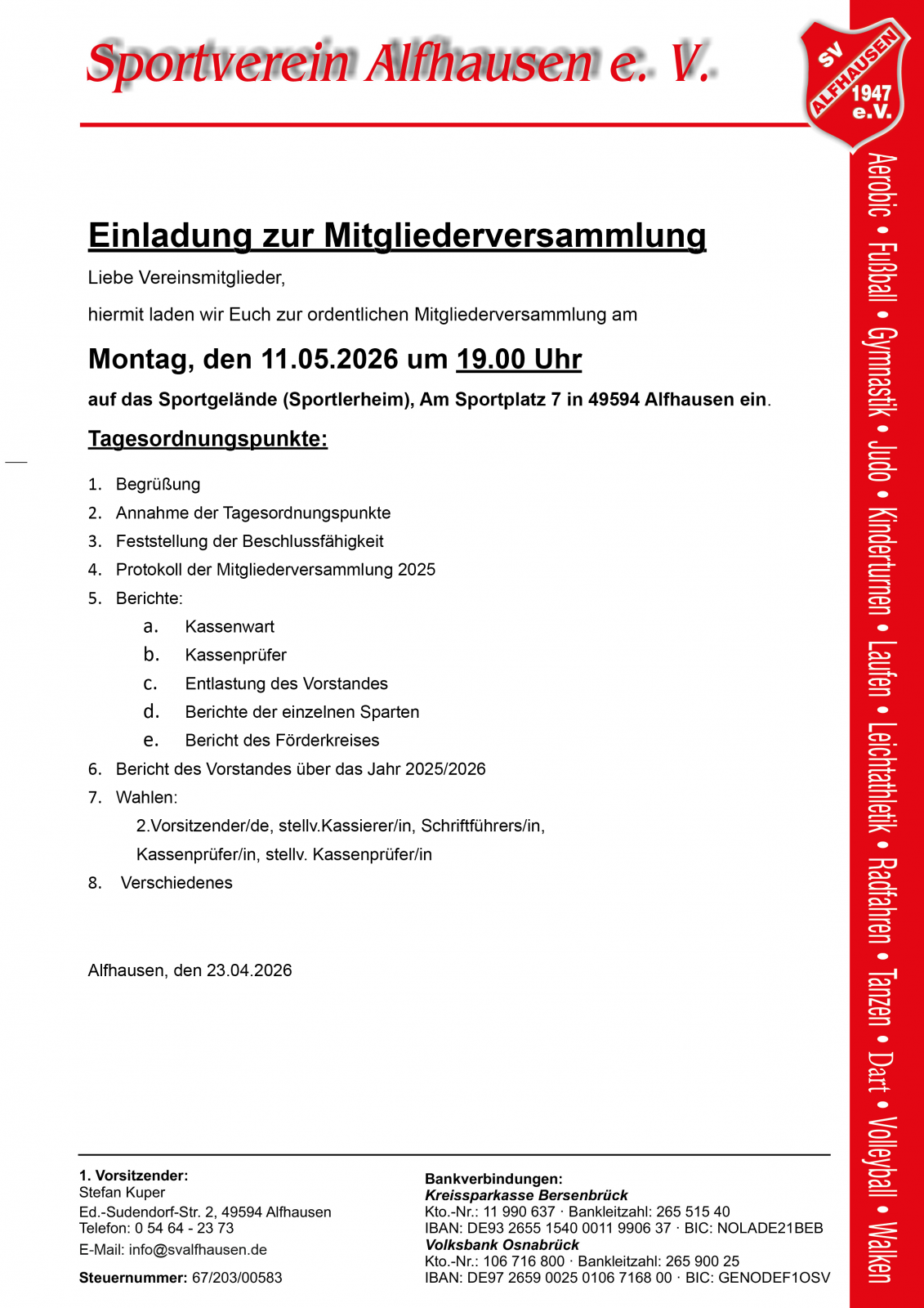 Der Sportverein Alfhausen e. V. lädt alle Vereinsmitglieder herzlich zur ordentlichen Mitgliederversammlung ein. Diese findet am Montag, den 11. Mai 2026, um 19:00 Uhr im Sportlerheim auf dem Sportgelände, Am Sportplatz 7 in 49594 Alfhausen, statt.